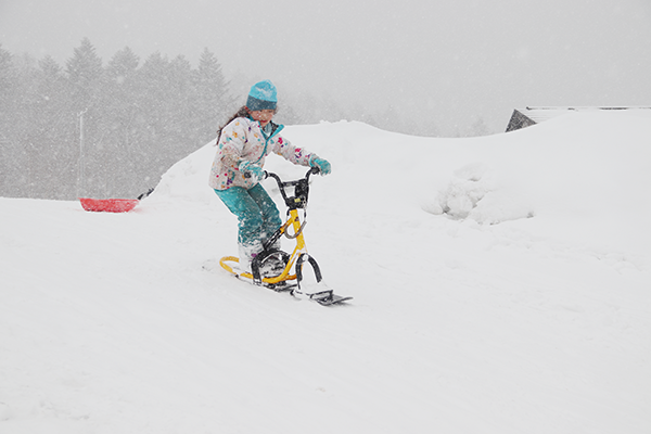 自転車とそりを合わせたような乗り物、スノースクート。雪の上で上手に滑ることができるかな?
