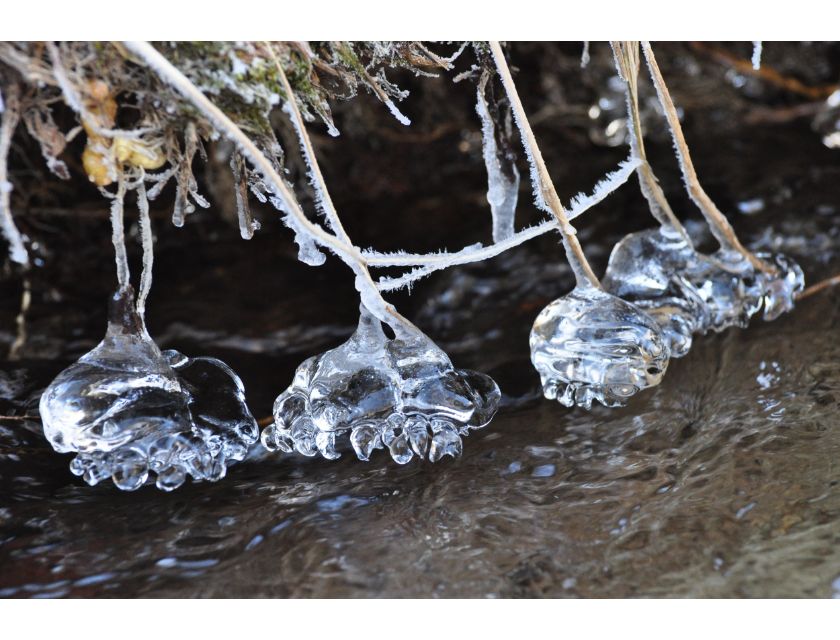 広場の横を流れる“水車の沢”で見つけた自然の氷のモニュメント。一体どのようにできたのかな?こんな探検も冬の楽しみ方の一つです。