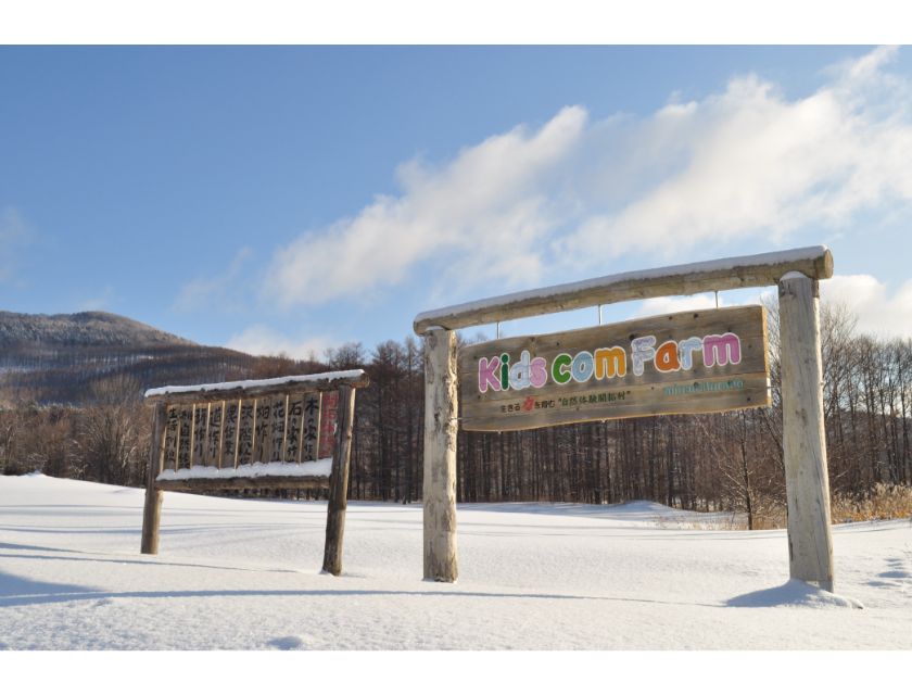 キッズコムファームの看板です。この看板から、30ヘクタールにも及ぶファームの広大な大自然が皆さんを待っています。